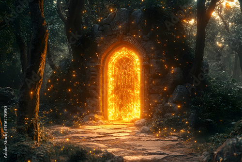 © Get it, Obraz premium Enchanting stone archway in a mystical forest, glowing with fiery light. A path leads to it, surrounded by magical sparks