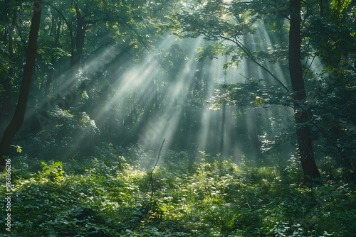© Valentin, Obraz premium Enchanting Sunlight Filtering Through a Lush Forest Canopy