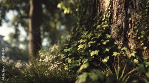 Obraz premium Enchanting Sunlight Through Trees with Ivy Clad Trunk and Wildflowers