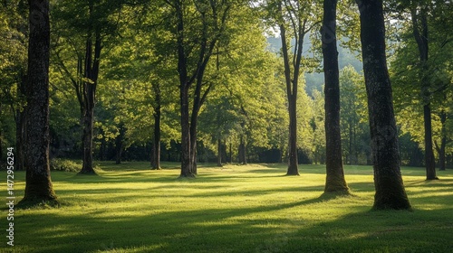 Naklejka premium Enchanting Sunlight Through Woodland Trees on Lush Green Grassy Meadow