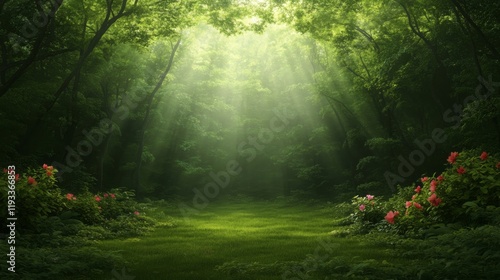 © Orawan, Fototapeta premium Enchanting Sunlit Forest Path Lush Green Trees Mystical Fog Vibrant Flowers