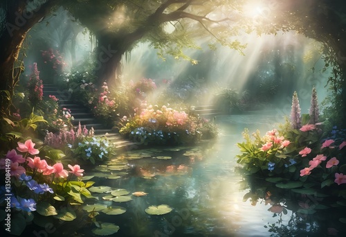 Fototapeta premium Enchanting Sunlit Garden Pond