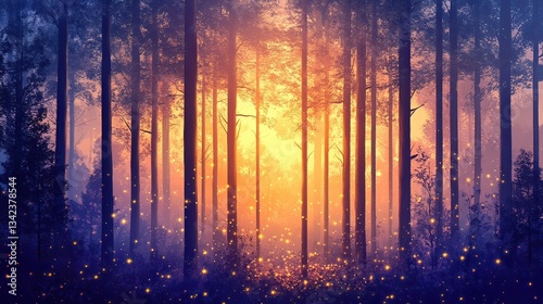 © krit, Fototapeta premium Enchanting sunrise in forest nature scene dreamy atmosphere magical view