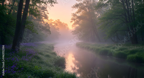 © Rengga, Obraz premium Enchanting Sunrise Over Misty Forest Stream With Wildflowers In Spring