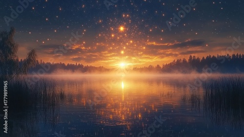 © lara, Fototapeta premium Enchanting Sunrise Over Misty Lake with Starry Sky
