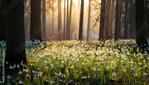 Fototapeta premium Enchanting Sunrise Over Snowdrop Flowers in a Misty Forest - Springtime Beauty in Nature