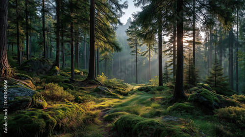 Fototapeta premium Enchanting sunrise walk through lush forest trails nature landscape