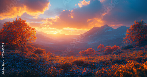 Naklejka premium Enchanting Sunset Over Vibrant Fields and Serene Mountain Ranges