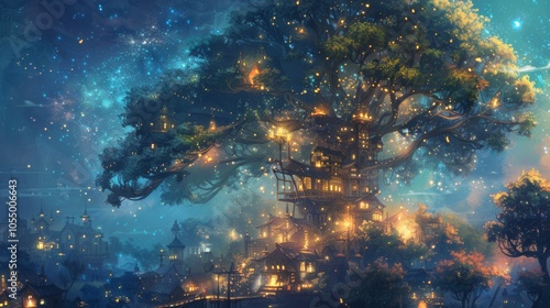 © A4719, Fototapeta premium Enchanting Treehouse Village Under Starry Night Sky