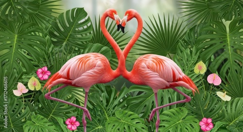 © Store, Fototapeta premium Enchanting Tropical Love Story of Two Flamingos Embracing in Heart Shape