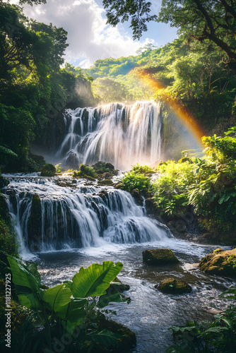 Fototapeta premium Enchanting Tropical Waterfall with Rainbow Amidst Lush Greenery and Mist