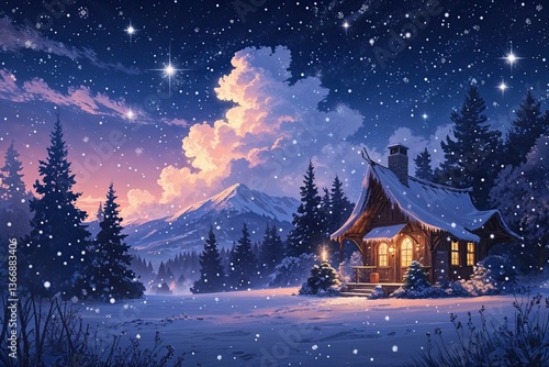 Fototapeta premium Enchanting Twilight Landscape with Celestial Snowflakes and Exquisite Illustrations