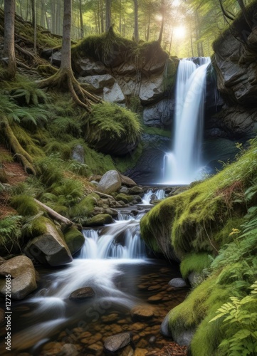 © Sayfar, Fototapeta premium Enchanting waterfall flowing through pristine wilderness of Bayerischer Wald Nationalpark, Bavarian landscape, serene, serene, idyllic
