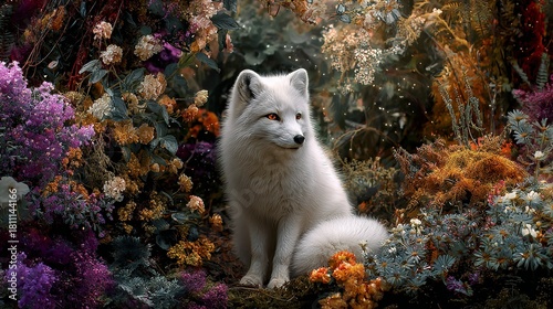 Fototapeta premium Enchanting white fox in a magical floral forest wonderland evoking fantasy and dreams, perfect for children's books or whimsical designs