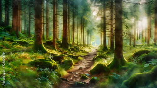 Fototapeta premium Enchanting wild forest path with watercolor effect