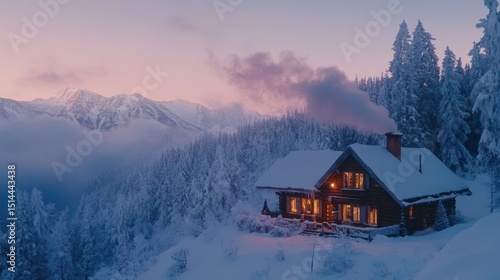 © IdaYuniati, Fototapeta premium Enchanting winter cabin nestled amidst snow-covered mountains at twilight hour