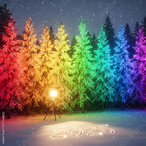 Obraz premium Enchanting winter forest adorned with a spectrum of rainbow lights, highlighting the snowy landscape and the illuminated celebration of a hopeful New Year 2026