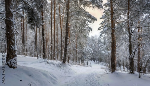 Naklejka premium Enchanting Winter Forest Scene A Serene Landscape Blanketed in Snow, Showcasing Majestic Trees and a Peaceful Atmosphere for Nature Lovers and Winter Enthusiasts Alike