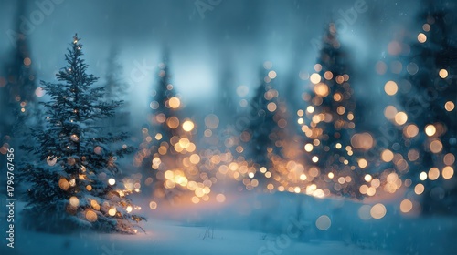 © Aleena, Naklejka premium Enchanting winter forest scene with glowing fairy lights illuminating snow covered evergreen trees at twilight