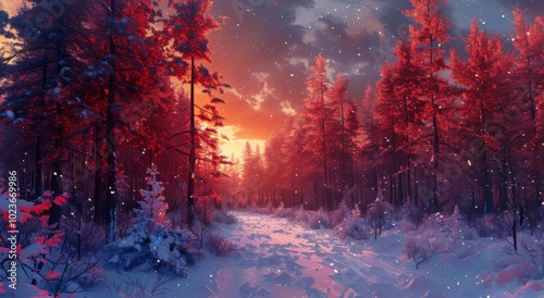 © PUTRI, Naklejka premium Enchanting Winter Forest with Red Trees and Snowfall at Twilight - Magical Snowy Landscape with Vibrant Colors and Starry Sky for Fantasy, Nature, and Holiday-Themed Designs