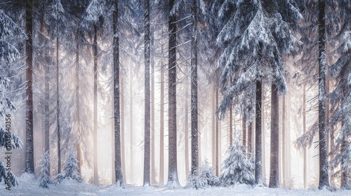 Obraz premium Enchanting winter forest with snow draped evergreen trees, soft sunlight through misty haze,