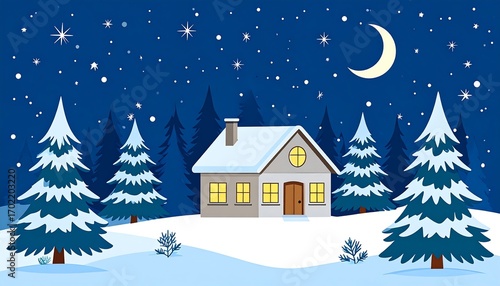 © Ojho, Naklejka premium Enchanting winter night scene with snow-covered house and forest trees