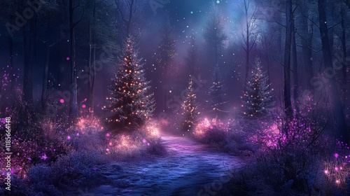 © RUENGWILAI, Naklejka premium Enchanting winter night walk through a snowy forest with christmas trees illuminated fantasy landscape dreamy view