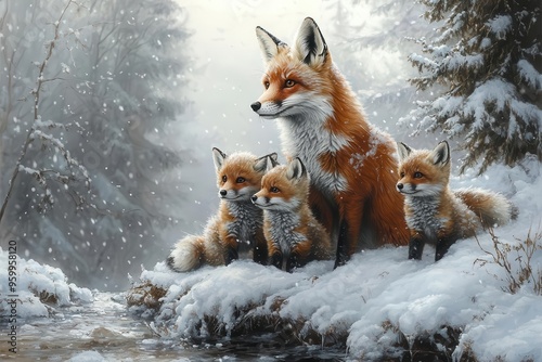 © julija, Obraz premium enchanting winter scene with a red fox and her playful cubs in a snowcovered forest surrounded by frostcovered pine trees