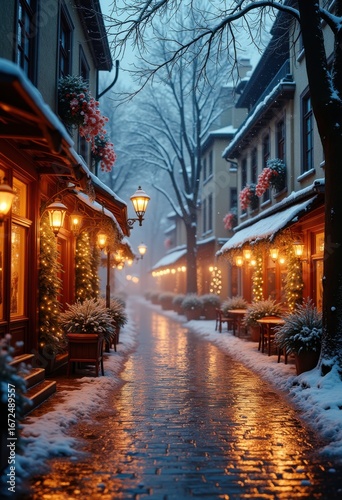 Obraz premium enchanting winter street scene rain snow blend urban atmosphere cozy glow...