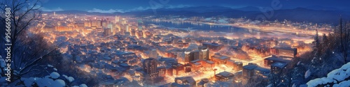 Obraz premium Enchanting Winter Wetlands: Soothing Anime-Style Illustration of Sapporo's Night Scenery with Cable Cars. Vibrant Nature-Inspired Artwork for NFT, Decor, Apparel Design, and Cultural Tourism Marketing