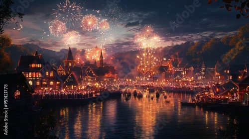 © JH45, Fototapeta premium Enchanting Winter Wonderland: Festive Fireworks over a Cozy Village