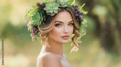 © dwphtra, Fototapeta premium Enchanting Woman Adorned with Succulent Flower Crown in a Lush Garden