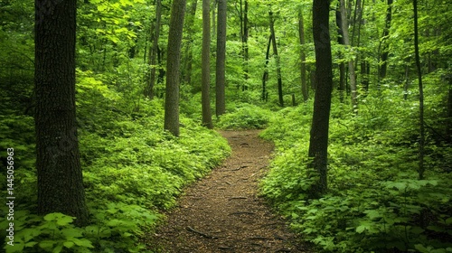 Obraz premium Enchanting woodland path beckons with lush greenery and sunlight filtering...