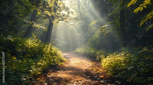 Fototapeta premium Enchanting Woodland Path with Sunlight Streaming Through Lush Foliage...
