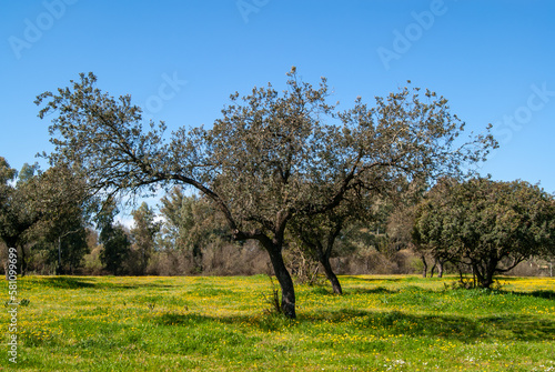 © Ivanb, Fototapeta premium Encina en la dehesa extremeña en un campo primaveral con flores amarillas.