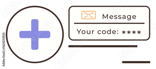 Obraz premium Enclosed email icon, verification code text field, and purple plus symbol indicating account setup or recovery. Ideal for login, registration, authentication, security, access, recovery simple flat