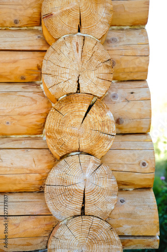 Naklejka premium end of wall composed of processed logs, log house texture