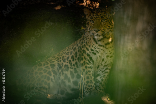 © photocech, Naklejka premium Endangered amur leopard resting on a tree in the nature habitat. Wild animals in captivity. Beautiful feline and carnivore. Panthera pardus orientalis.