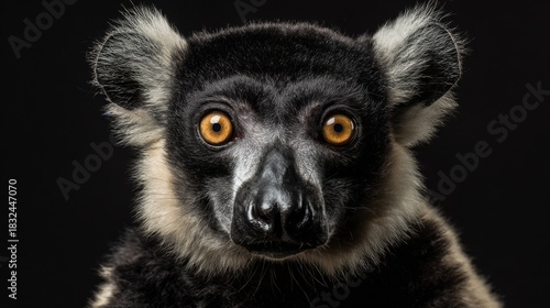 Naklejka premium Endangered black and white lemur with striking orange eyes poses against a...