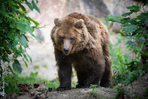 Fototapeta premium Endangered brown bear walks through forest clearing