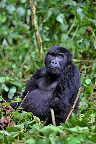 Naklejka premium Endangered eastern gorilla in the beauty of african jungle, silverback and family, Gorilla beringei, Democratic Republic of Congo, rare african wildlife