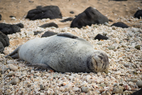 Naklejka premium Endangered Hawaiian Monk asleep on rocks