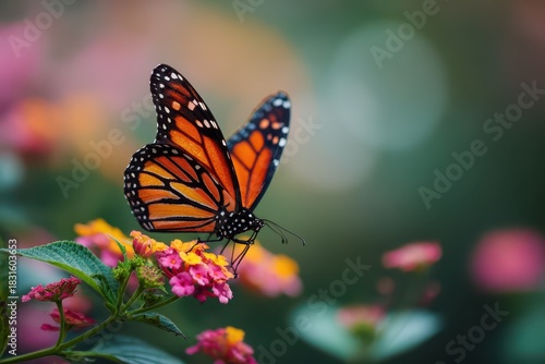 Naklejka premium Endangered monarch butterfly feeding on vibrant flowers in a lush garden...