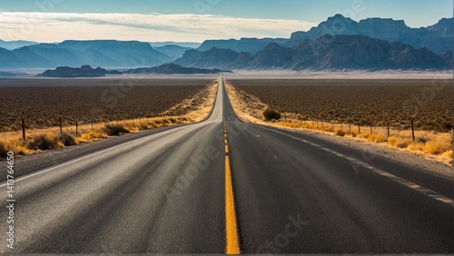 Fototapeta premium Endless Asphalt: A Journey Through the Desert Landscape, Where the Open Road Meets the Distant Mountain Ranges.