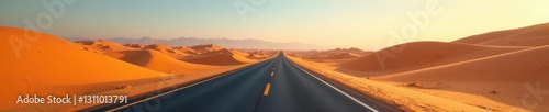 Fototapeta premium Endless asphalt ribbon cuts through desolate dunes, mirage shimmering, heat, wild, sun