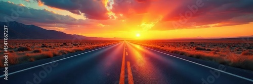 Naklejka premium Endless asphalt ribbon stretches towards a vibrant sunset horizon, promising...