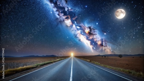 Fototapeta premium Endless Asphalt Under a Celestial Canvas A Nighttime Journey Towards the Radiant Milky Way and a Full Moon