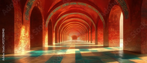 © Ali, Obraz premium Endless brick arches receding into glowing light.