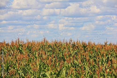 Obraz premium Endless corn field with blue cloudy sky at Sunny summer day, beautiful rural...