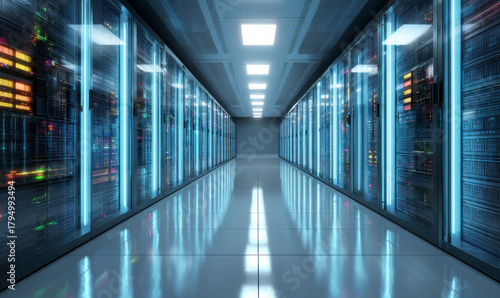 © heerim studio, Fototapeta premium Endless data: A server room perspective showing rows of running servers.